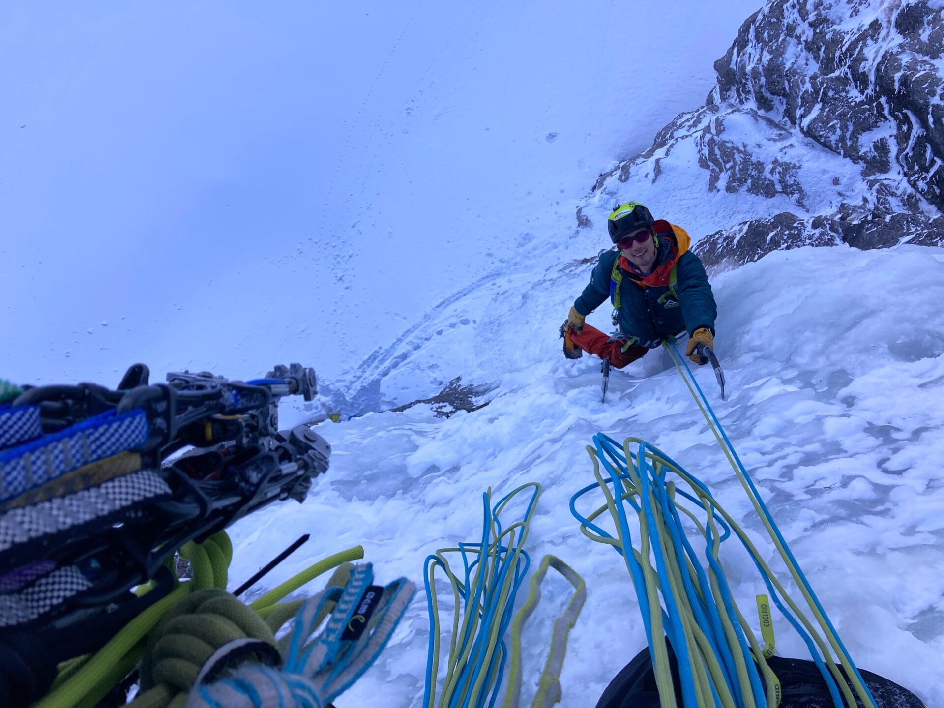 2. SL: 30 m WI3, 45° Gerade hoch zur großen Rampe. Stand eingerichtet mit 3 NH.