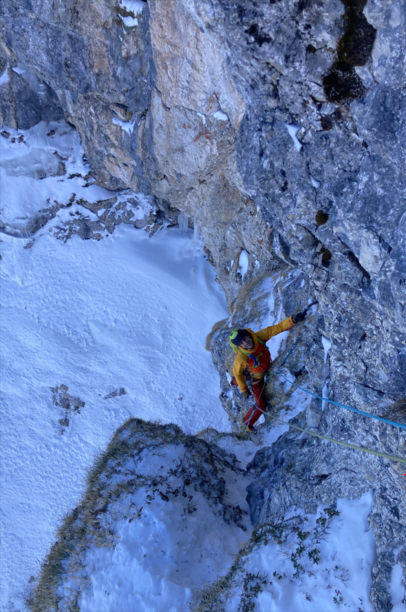 1. SL: 40-45 m M7+, WI6, je nach Bedingungen auch schwerer. Das Felsdach wird links umgangen. Absicherung mit Beaks, Cams, einem BH und Eisschrauben. Stand im Eis.