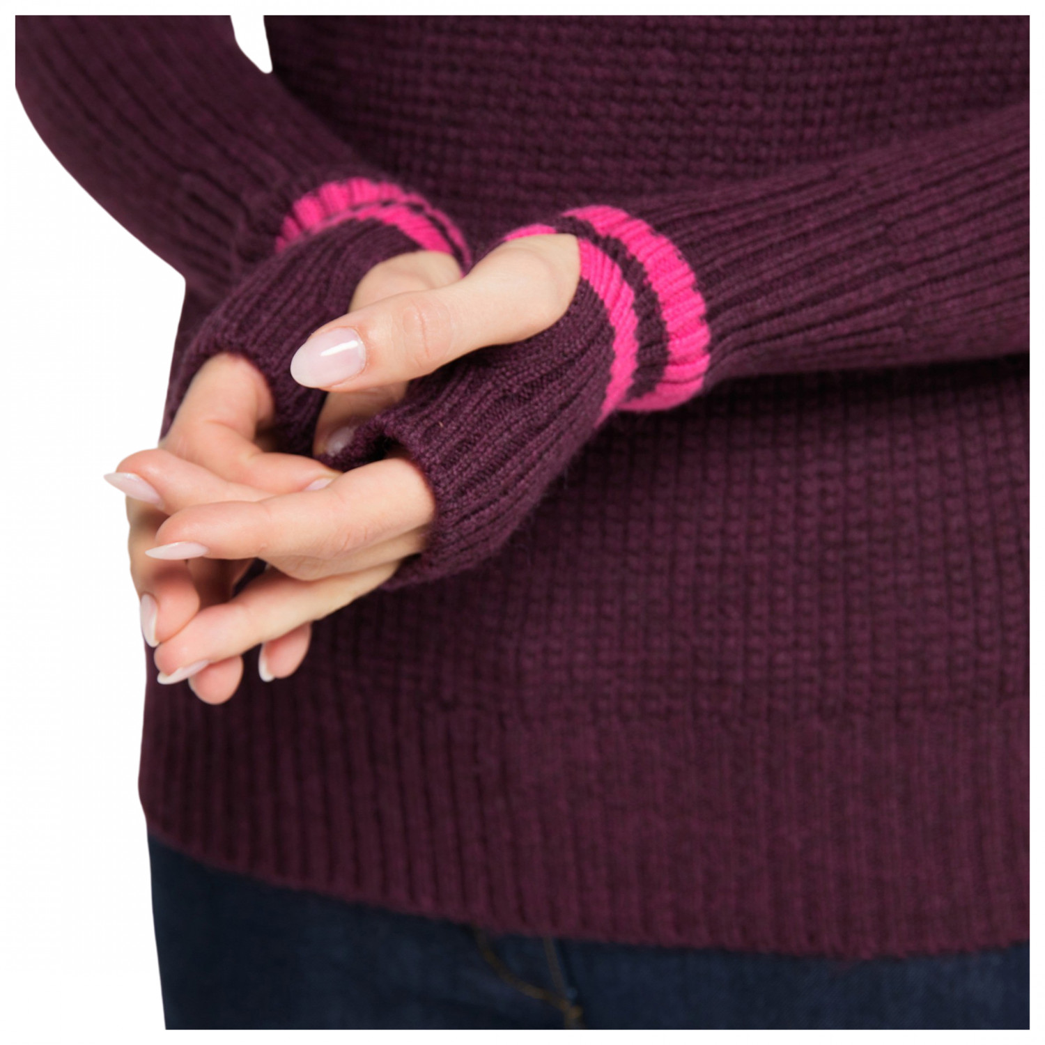 Ich bin ein kleiner Mensch (155 cm)und normale Erwachsenen Klamotten passen mir selten. Der Pulli in XS sitzt wie für mich gestrickt. Armlänge, Länge allgemein und auch die Breite. Die Farbe (Bordeaux) ist kräftig und die rosa Kontraststreifen sind, finde ich, gelungen.