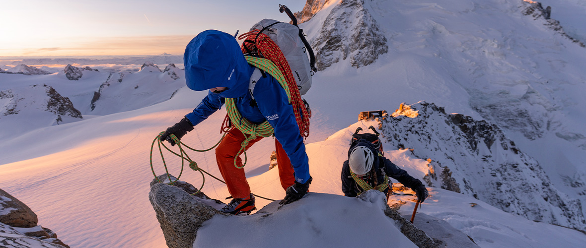 Pertex® Quantum Pro mit Diamond Fuse-Technologie wird als Obermaterial für die Daunenprodukte dieser Kollektion verwendet und bietet wetterfeste Performance ohne zusätzliches Gewicht – perfekt für extreme, ungeschützte alpine Umgebungen.