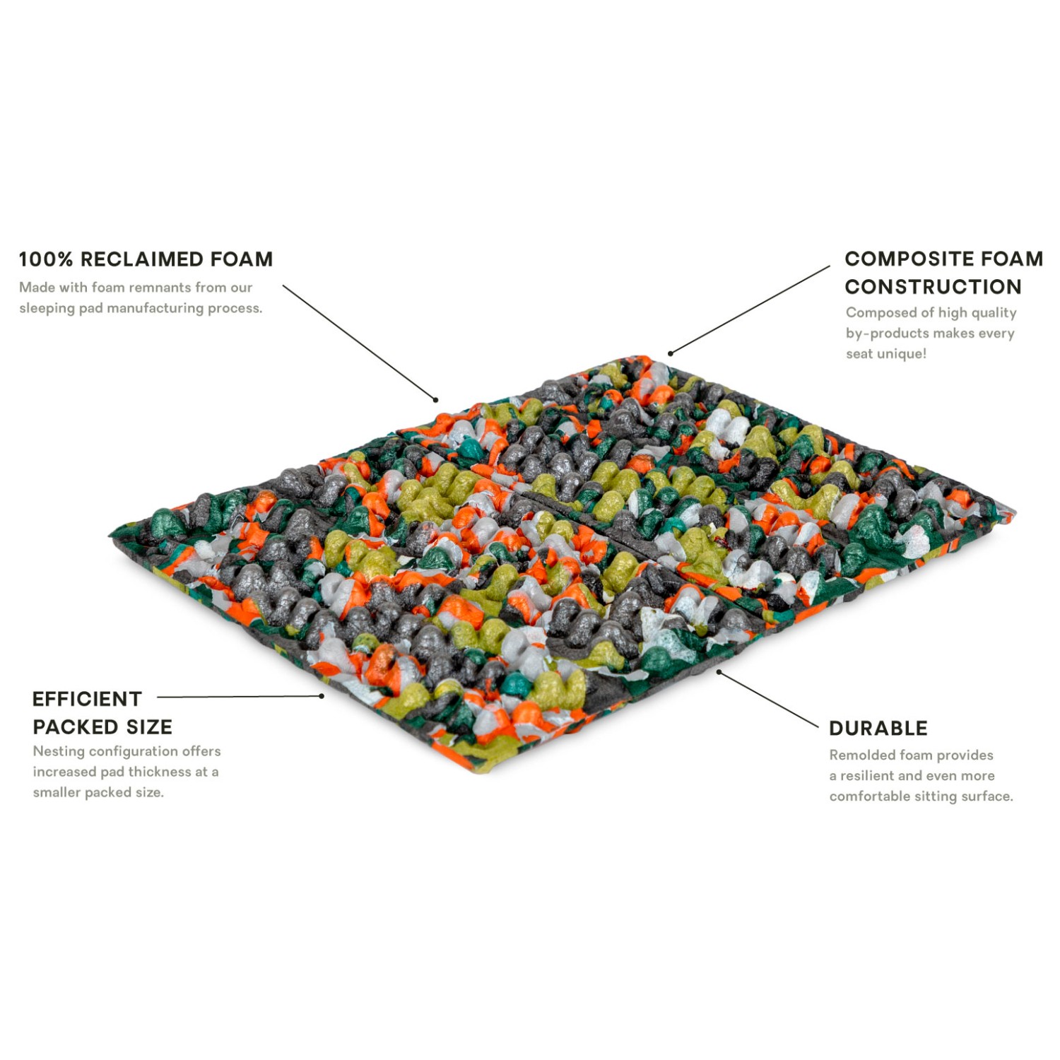 Hergestellt aus wiederverwerteten PE‑Schaumresten, die bei der Produktion von Schlafmatten anfallen, erhält jedes Chipper‑Kissen seinen eigenen, einzigartigen Look. Somit ist jedes Kissen ein Unikat! Durch das Remolding der Materialreste entsteht ein besonders widerstandsfähiges und langlebiges Sitzpolster. Dieses Verfahren reduziert außerdem Abfall und sorgt gleichzeitig für ein Material, das erstaunlich stabil bleibt – selbst bei intensiver Nutzung. Die spezielle Mischung verschieden verdichteter Reste sorgt für eine angenehme Dämpfung, die sich bei langen Pausen am Berg, auf feuchten Wiesen oder beim Camping bezahlt macht.