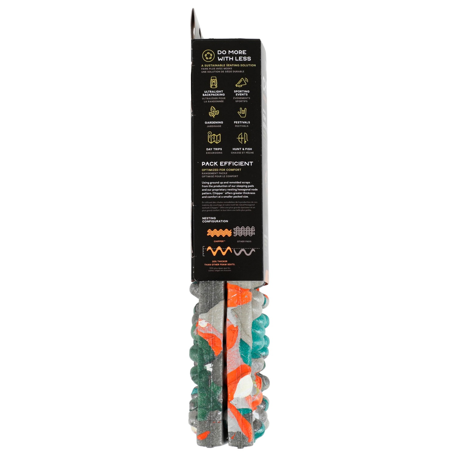 Dank des hexagonalen Nesting‑Designs, das von der Switchback‑Matte inspiriert ist, lässt sich Chipper extrem kompakt verstauen. Das macht es zum perfekten Begleiter für Wanderungen, Trekkingtouren, Festivals oder den Alltag – überall dort, wo Du spontan eine bequeme, isolierende Sitzunterlage gebrauchen kannst.