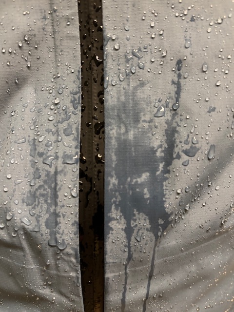 Die Jacke ist leider nicht wasserdicht. Bereits nach kurzer Zeit (30 Minuten) dringt das Wasser im Bereich der Schultern und des Bauchbeginns durch. Die leichte Jacke unter der Regenjacke sowie der Pullover waren am Ende der Tour durchnässt. Ist bei knapp über 5 Grad Außentemperatur nicht besonders gut…