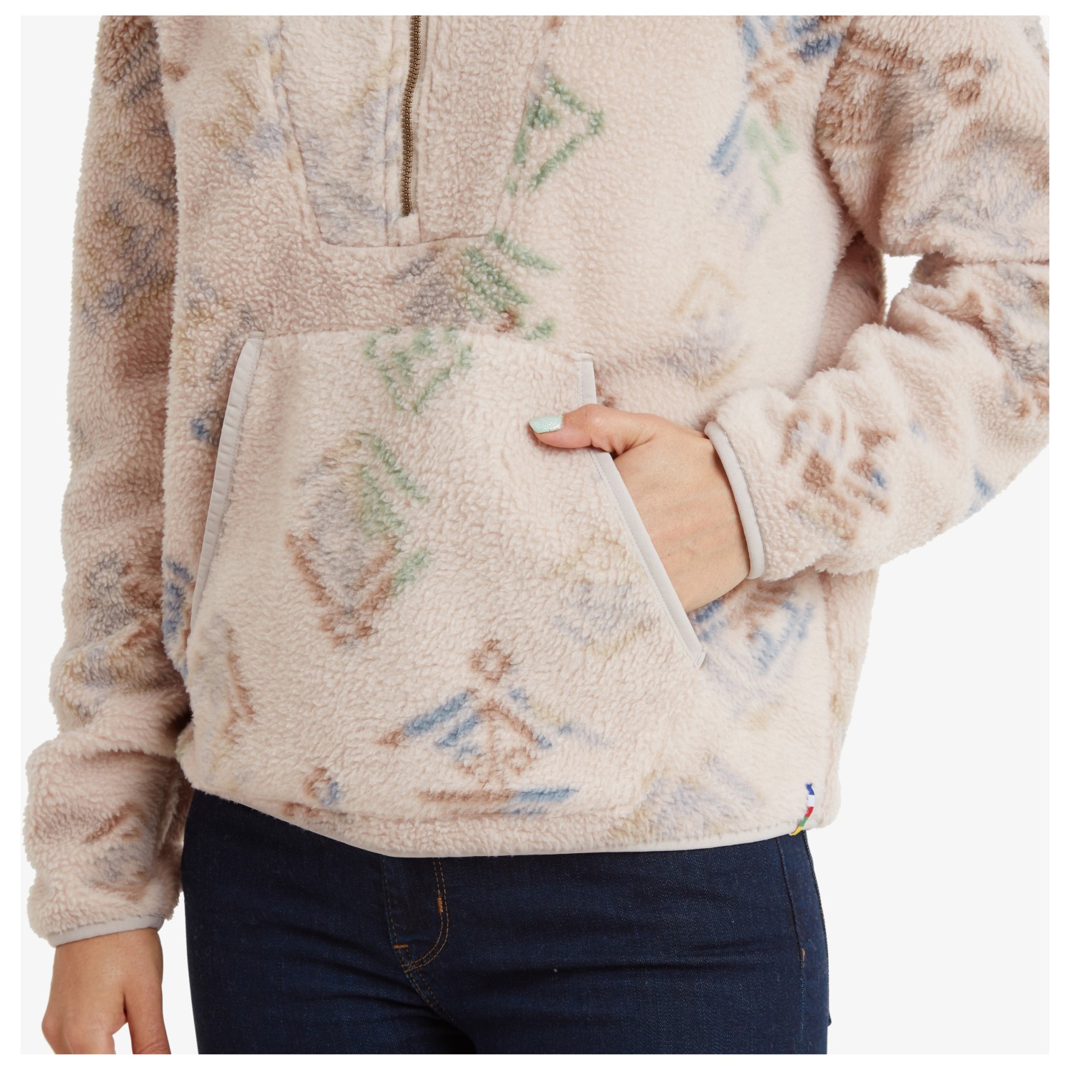 Sherpa hat mich bisher immer übzeugt - diesmal aber nicht. Das Fleecematerial ist erstaunlich fest und steif, wie ein festes Fleece-Tuch für eine Picknickdecke. Der Pulli "fällt" daher nicht in Form, sondern steht vom Körper ab. Auf dem Bilschirm sahen die farben herbstlich, leuchtend aus. In Realität sind es unterschiedlich gedeckte Brauntöne.